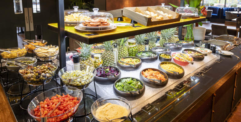 Alongside the meats, guests can enjoy an unlimited gourmet salad bar featuring fresh vegetables, cheeses, cured meats, and traditional Brazilian side dishes.